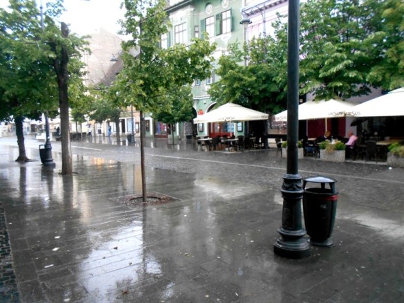Amiază în Sibiu. O rafală de ploaie ne-a alungat de la terasa unde am luat prânzul. După ce s-a oprit am pornit pe esplanada Nicolae Bălcescu. Strada a fost creată în perioada parcelării Orașului de Sus (secolul XIV) care asigura legătura între Piața Mare și Poarta Cisnădiei, pavată cu piatră de râu (1762) înlocuită cu granit (1875), pe care, din 1905 au funcționat liniile tramvaiului electric. În 1970 acestea au fost scoase și strada, denumită Nicolae Bălcescu, a devenit pietonală.