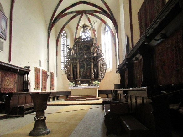 Interiorul era sobru. Se remarcau altarul, o cristelniță din bronz (1440) și orga folosită azi pentru concerte ce se desfășoară în biserică.