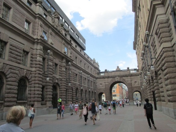 Am trecut un pod pietonal, Podul stabil (Stallbron), care a fost construit din oțel (1879-1904) pe locul celui mai vechi pod de lemn din oraș, înlocuit cu unul din fontă (1843). Podul a fost completat cu partea sa de vest (1982) pentru a acoperi porțiunea de metrou care leagă clădirea Parlamentului ( Riksdagen) cu Cancelaria Guvernului (Kanslihuset), o clădire a cărui portic era decorat cu patru coloane dorice (1790).
