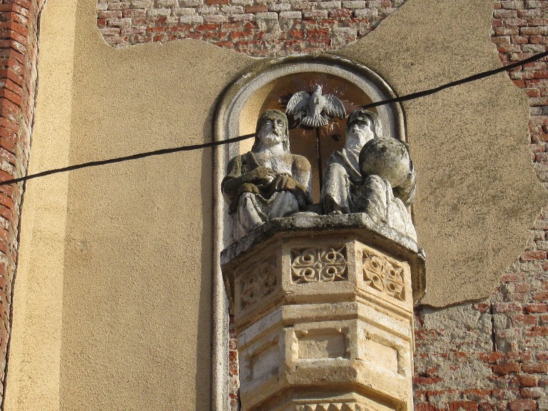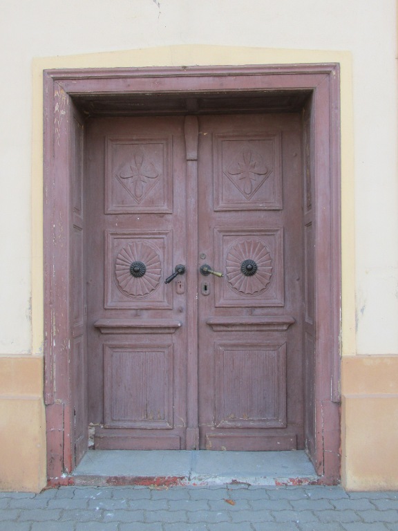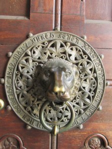 Pe ușa din stânga a portalului central, folosit pentru deschiderea ei, am văzut cea mai veche piesă păstrată în biserică (1342), un cap de leu din bronz care a fost copiat și postat pe ușa din dreapta (1849).