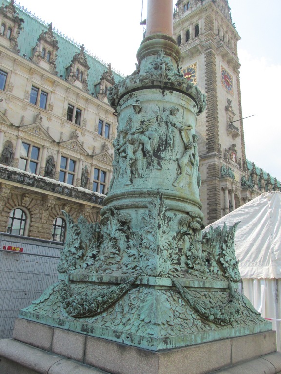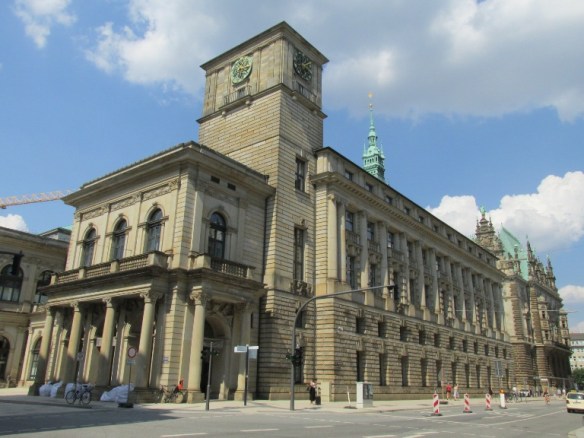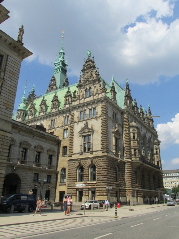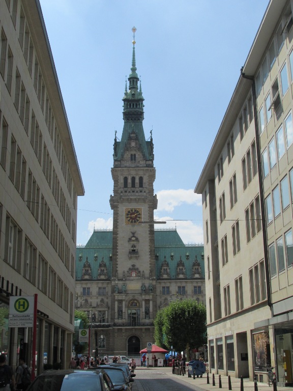 Și, în sfârșit, lăsată de mine la urmă, Primăria (Rathaus), într-o clădire din secolul XIX în care funcționează și Senatul liber și hanseatic și Parlamentul Hamburg. Inițial au existat două Primării, una în orașul vechi episcopal și una în orașul nou al ducelui. Când cele două orașe s-au unit a fost construită o Primărie nouă, comună (1216) care a fost distrusă într-un incendiu (1284). A rămas doar pivnița care a fost folosită ca magazin de vinuri și cramă. A fost construită o nouă Primărie care a supraviețuit până la marele incendiu din 1842 când a fost distrusă.