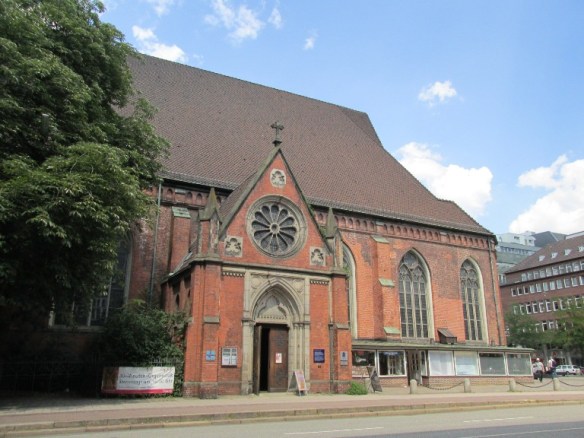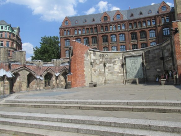 Printre clădirile cu sedii de firme am ajuns la bulevard. L-am traversat spre ruinele unei biserici dedicate ca Memorial „Sf. Nicolae” (Mahnmal St. Nikolai) a victimelor războiului 1933-1945.