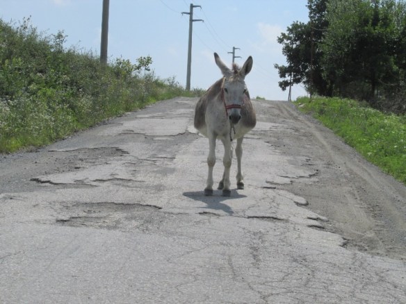 Mai aveam de văzut ultimul sat aparținător comunei Forotic așa că m-am îndreptat spre sud, de data asta pe un drum cândva asfaltat, plin de gropi, pe care l-aș fi schimbat bucuroasă cu cel de pământ urmat până acolo. Cică ne apropiam de civilizație ? Chiar am întâlnit și o ființă vie. Un măgar căpos stătea proțăpit în mijlocul drumului barându-ne calea.