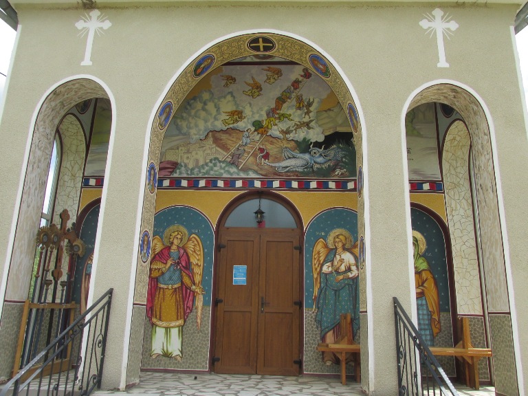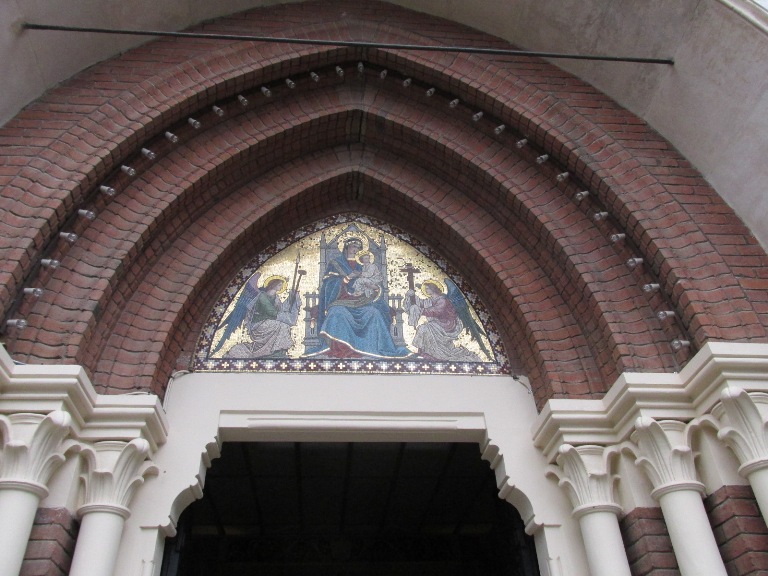 Deasupra intrării în biserică a fost postat un mozaic reprezentând-o pe „Maica Domnului cu Pruncul în brațe”.