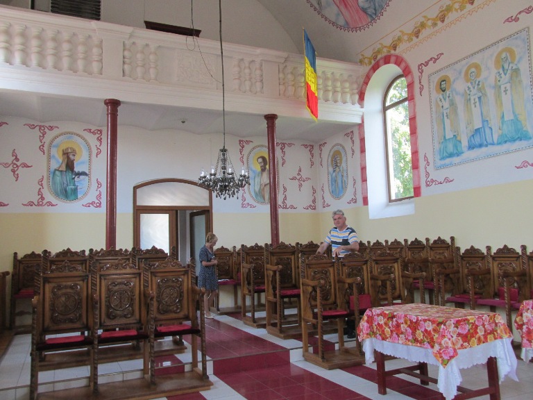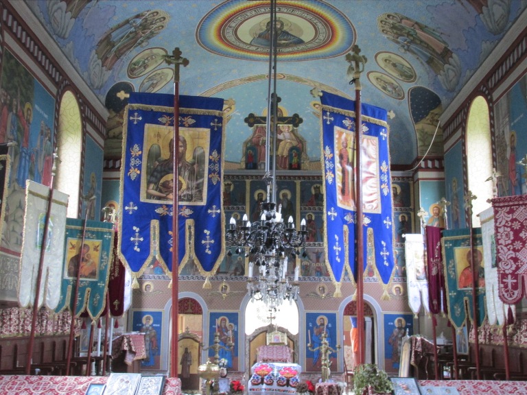Interiorul a fost pictat în ulei, reprezentând personaje biblice și pe peretele vestic ctitorii bisericii și Regele Carol I.