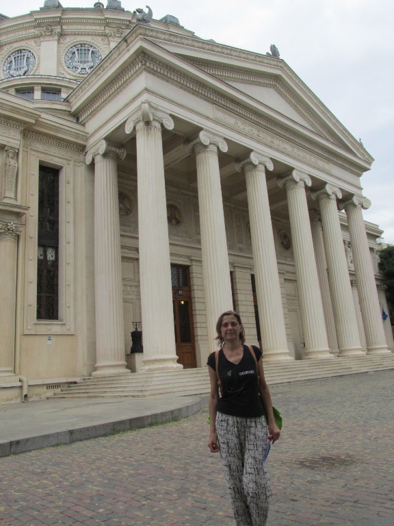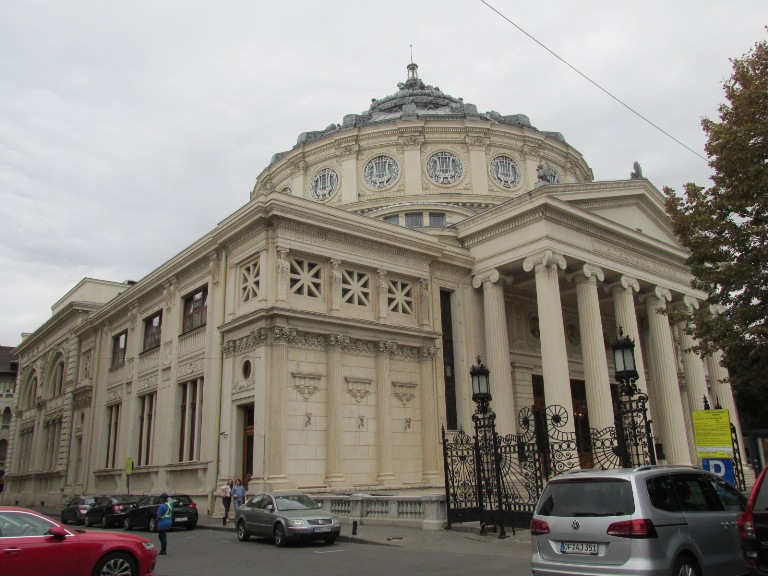 Am ajuns în spatele Ateneului Român, o clădire în stil neoclasic cu elemente eclectice și ale arhitecturii franceze. La sfârșitul secolului XIX în acel loc era un maidan de periferie și o livadă aparținând familiei Văcărescu. Pe maidan a funcționat un circ american care în scurt timp a falimentat, nelăsând în urmă decât o fundație cu un zid circular. Printr-o campanie cu sloganul „Dați 1 leu pentru Ateneu!” și adunarea de fonduri, a fost construit Ateneul Român (1886-1889).