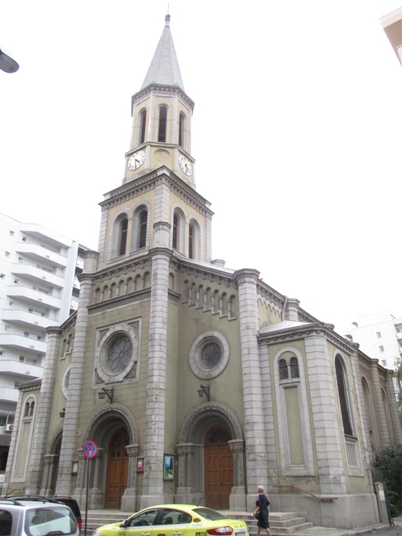 Pe o străduță laterală se înălța turnul unei biserici așa că m-am îndreptat spre ea. Biserica Evanghelică Luterană, de Confesiune Augustană, a fost construită cu caracter eclectic, îmbinând mai multe stiluri: neo-gotic, neo-renascentist, romanic, bizantin (1851-1853), din fondurile donate de credincioșii luterani și personalități ca Franz Liszt, Franz Josef I al Austriei, Gh. Bibescu. Turnul său având 36 metri înălțime, la acea vreme a fost cea mai înaltă clădire din București. Regina Elisabeta fiind de confesiune evanghelică, Familia Regală participa frecvent la slujbe și pentru ei, pe aripa de nord a fost construită o lojă (1869). Distrusă de incendiul din 1912, a fost refăcută și turnul a fost dotat cu clopote și ceas. A fost avariată în mai multe cutremure, prin bombardamentele din 1944, refăcută de fiecare dată și în 2007 a fost consolidată și renovată. În biserică se desfășoară câteodată concerte de orgă și clavecin.