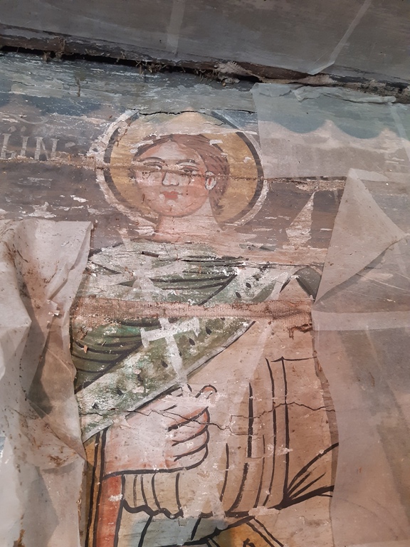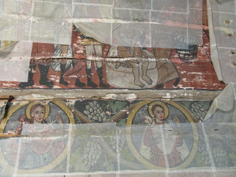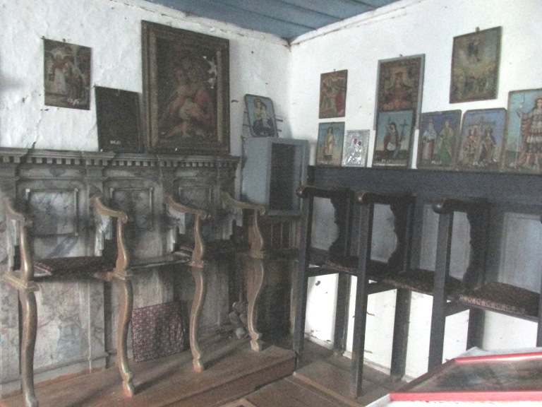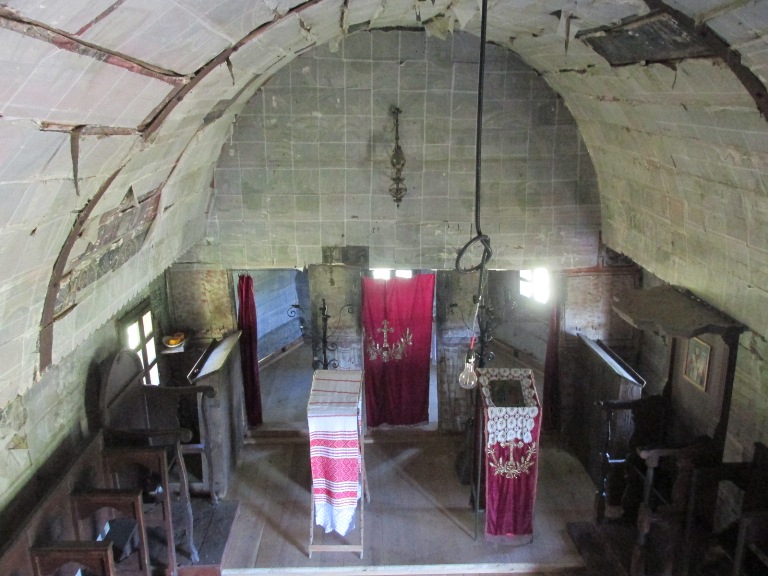 Interiorul a fost decorat cu picturi pe lemn, reprezentând personaje și scene biblice care, în momentul vizitei mele, erau acoperite pentru a fi protejate.