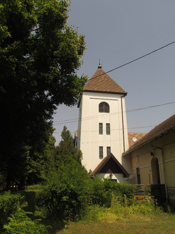 Turnul, înalt de 47 metri, încadrat de 4 turnulețe, atestă dreptul de judecată al Reghinului în acea perioadă. În decursul timpului a fost distrusă de numeroase incendii, cel din 1708 provocat în timpul răscoalei antihabsburgice condusă de Francisc Rákóczi II. Abia în 1778 a fost reparată, decorată cu elemente în stil baroc și dotată cu o orgă nouă. Între anii 1929-1930 a fost renovată și în perioada 1959-1961 consolidată.