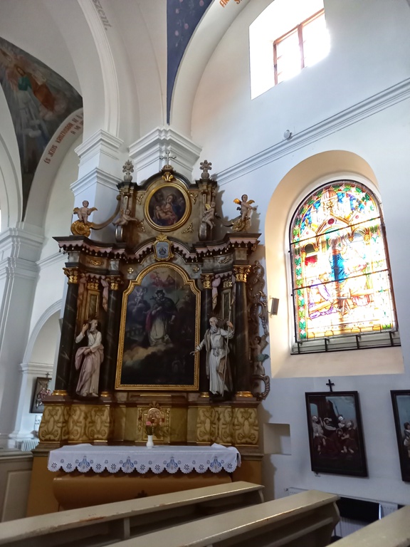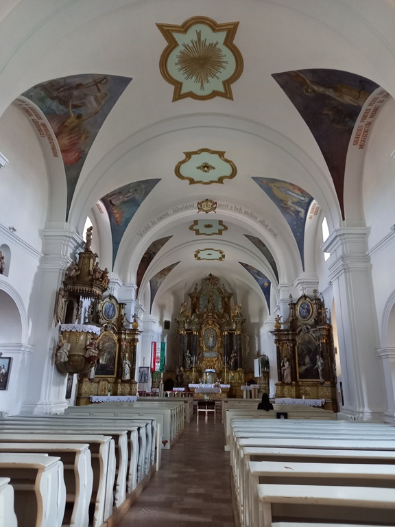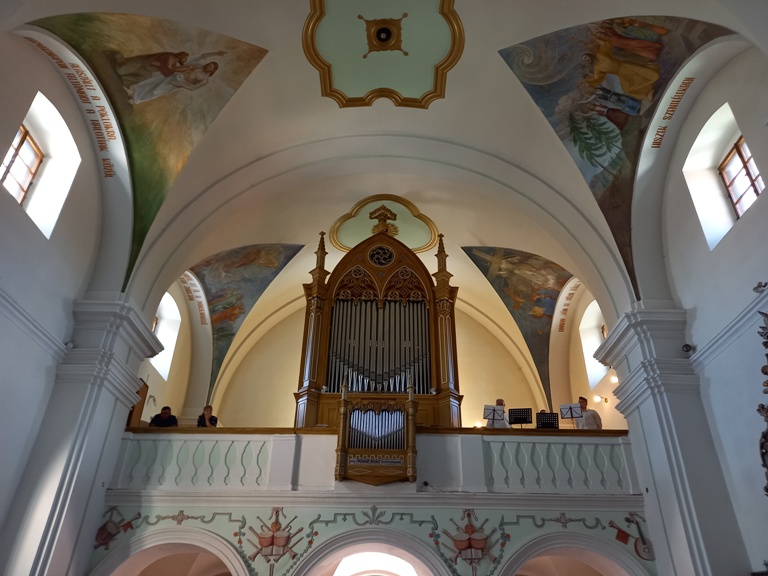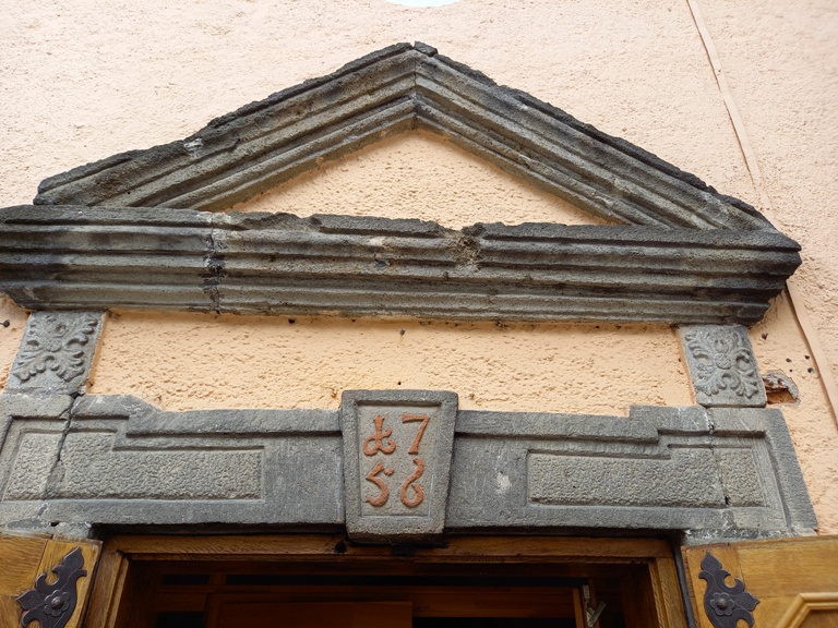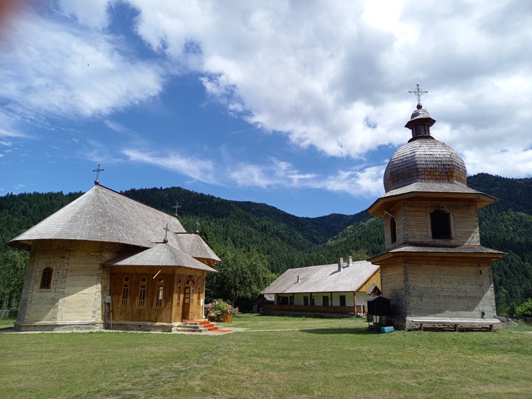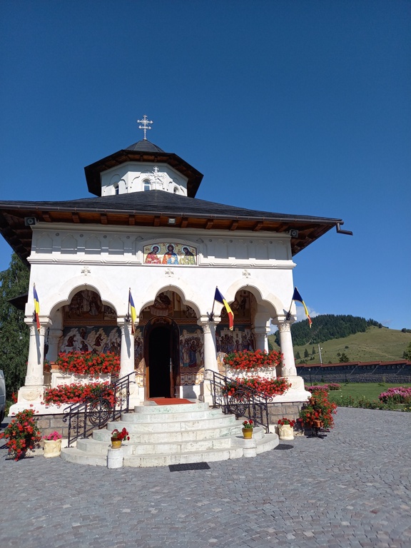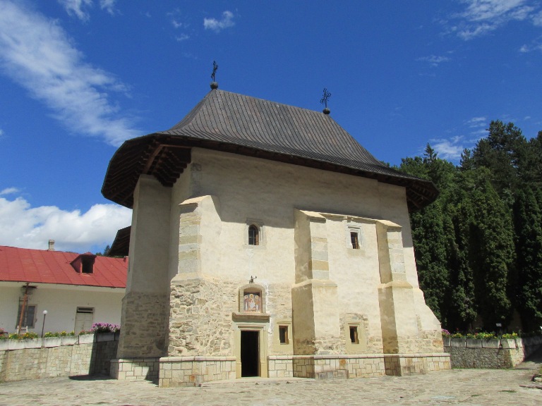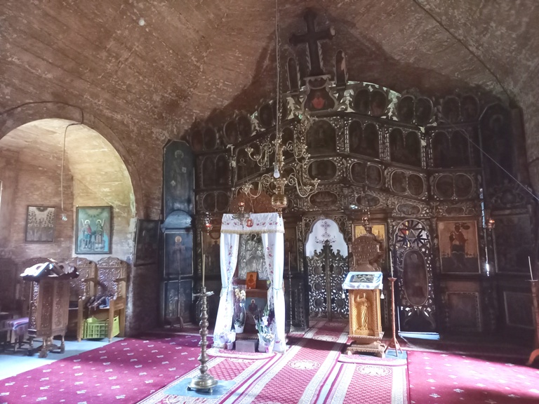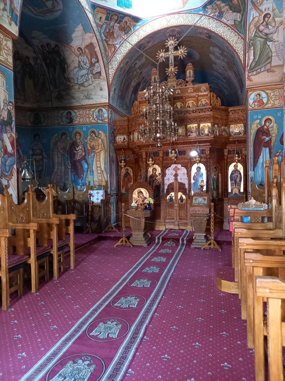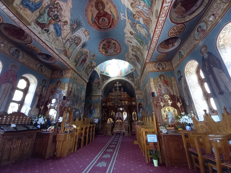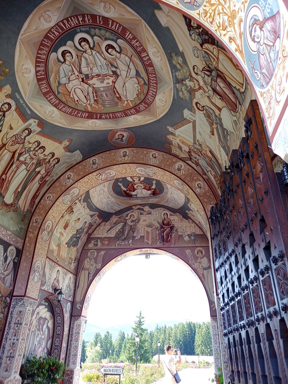 Am intrat printr-o poartă de lemn de stejar sculptat, situată la baza clopotniței, pe sub bolta pictată în frescă, reprezentând scene și personaje biblice.