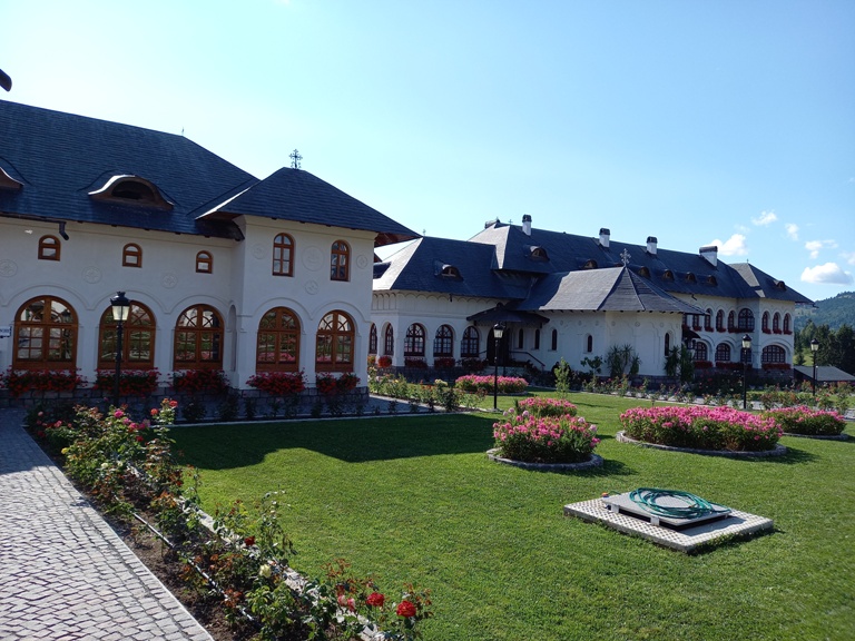 În curtea mânăstirii, ornamentată cu numeroase spații cu flori multicolore, se aflau mai multe clădiri. Pe o latură se întindeau corpurile pentru chilii, în stil brâncovenesc, casa duhovnicului, ateliere de pictură, croitorie, tâmplărie, etc., activități zilnice ale măicuțelor.
