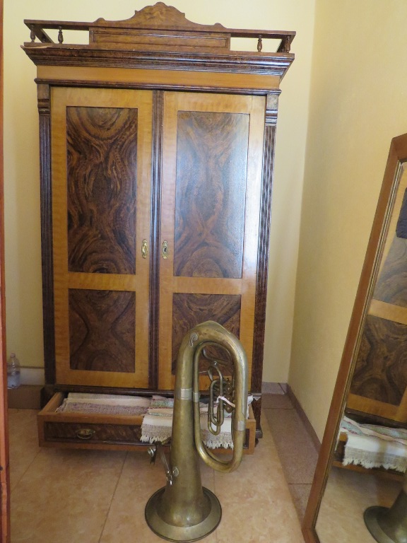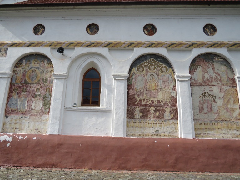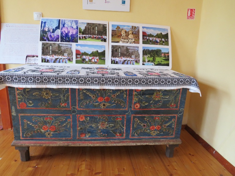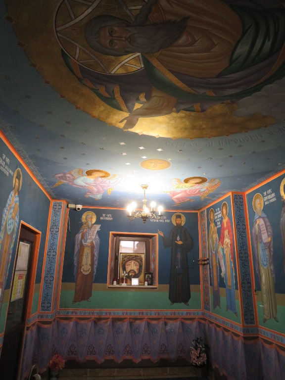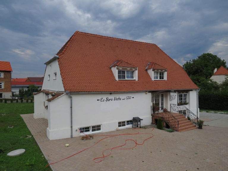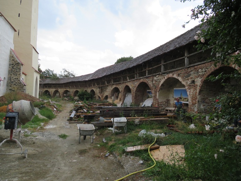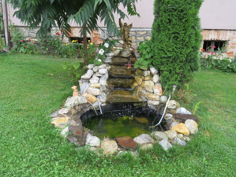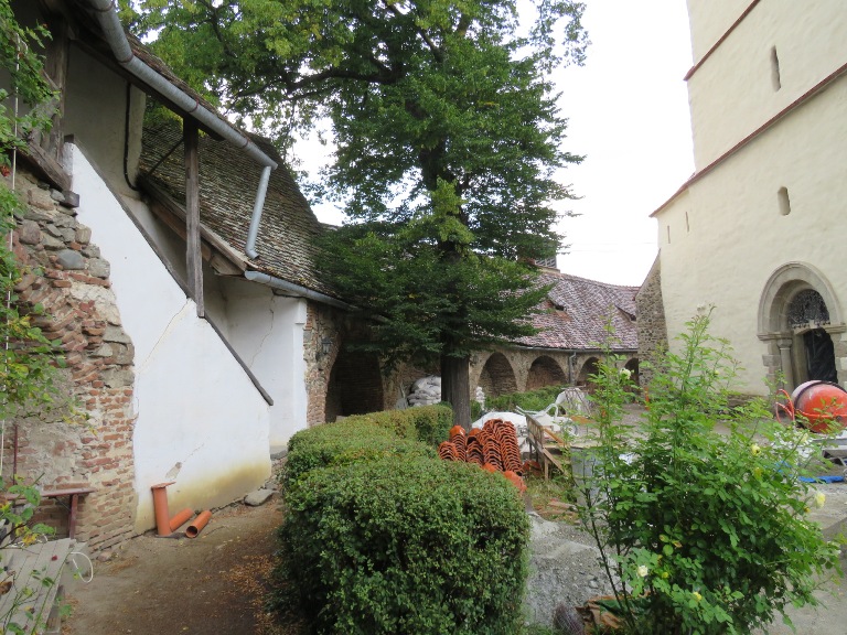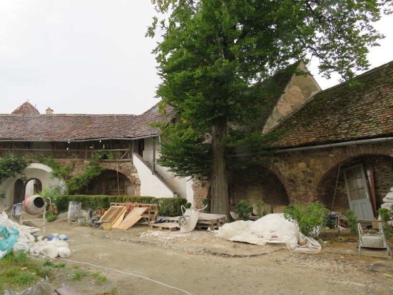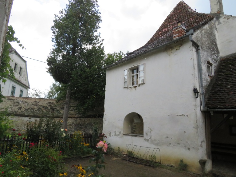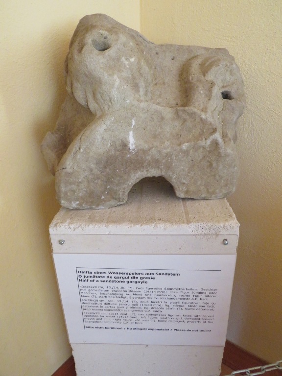 În colțul uneia dintre încăperi am văzut o jumătate de gargui, ornament din gresie al unui fost burlan, o jumătate prezentând un tânăr și cealaltă un bătrân.