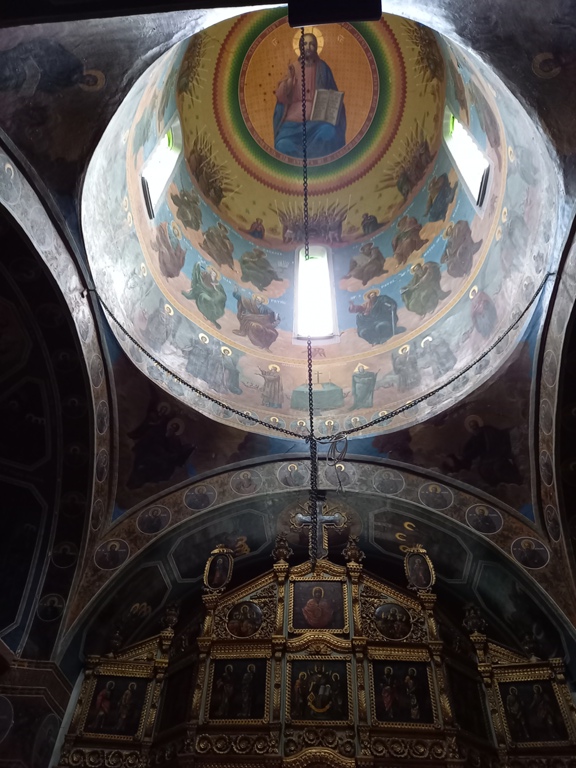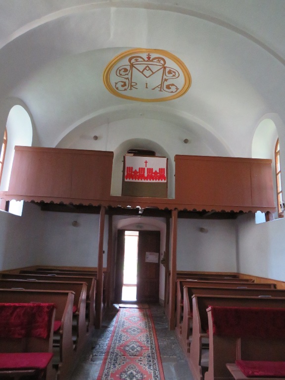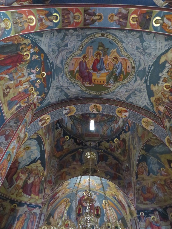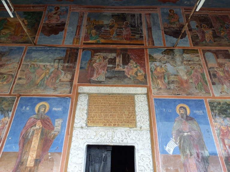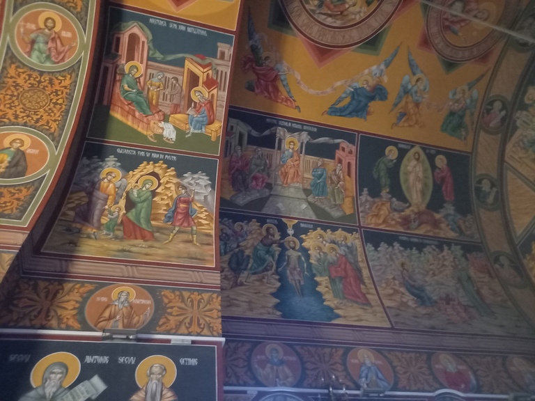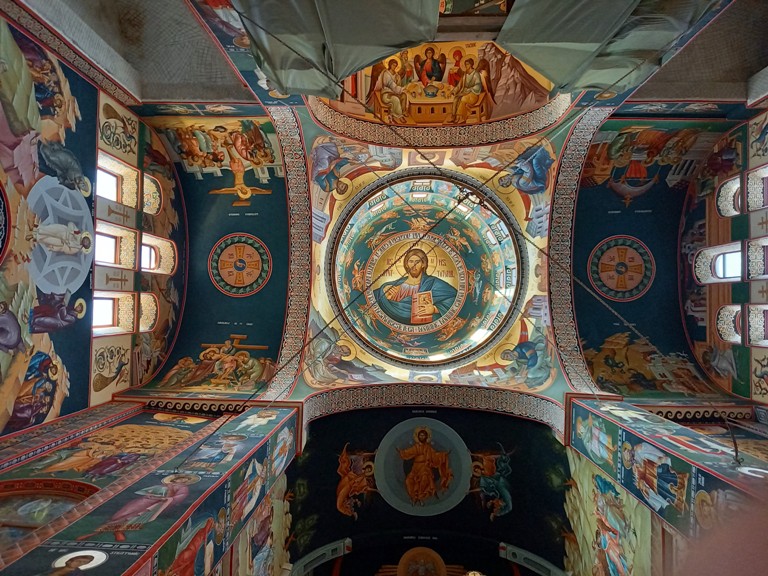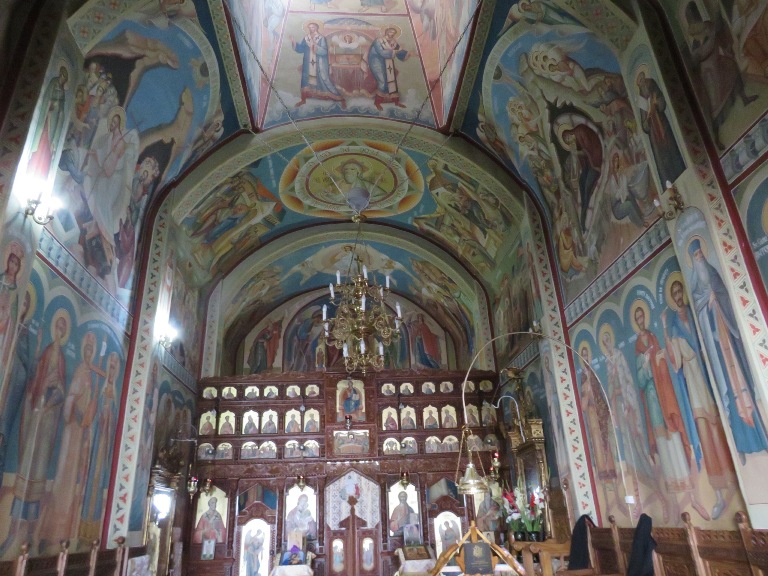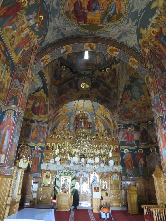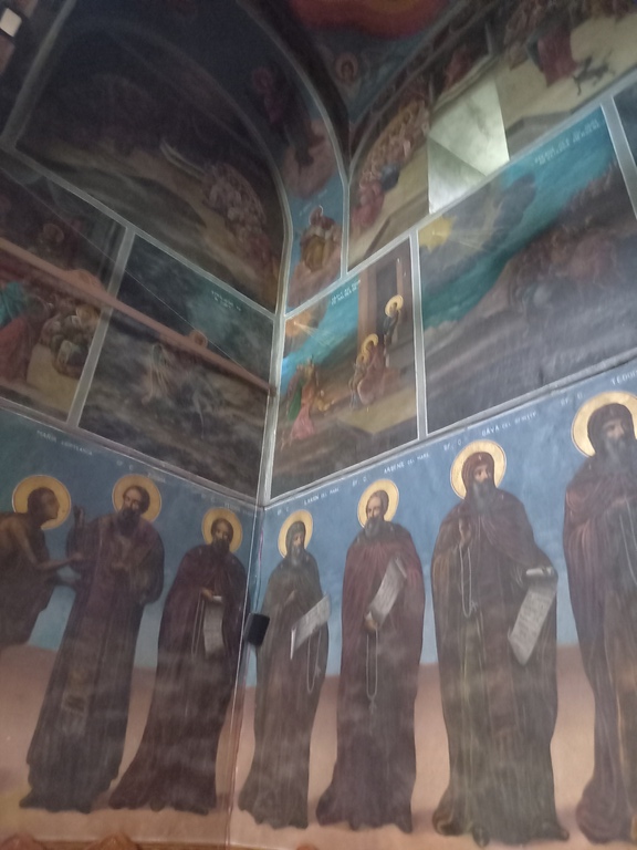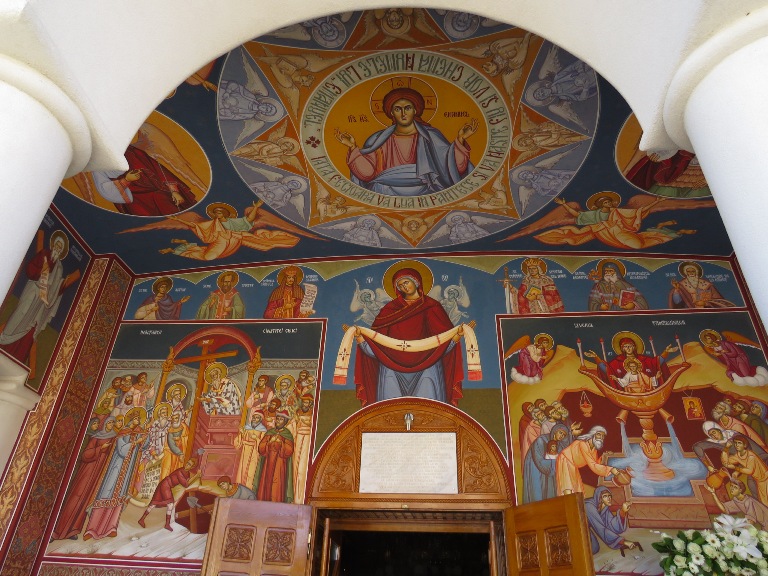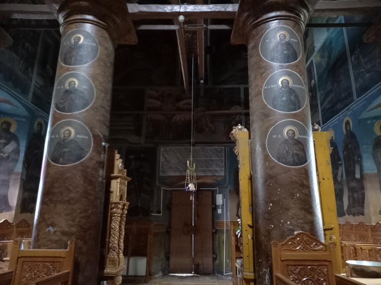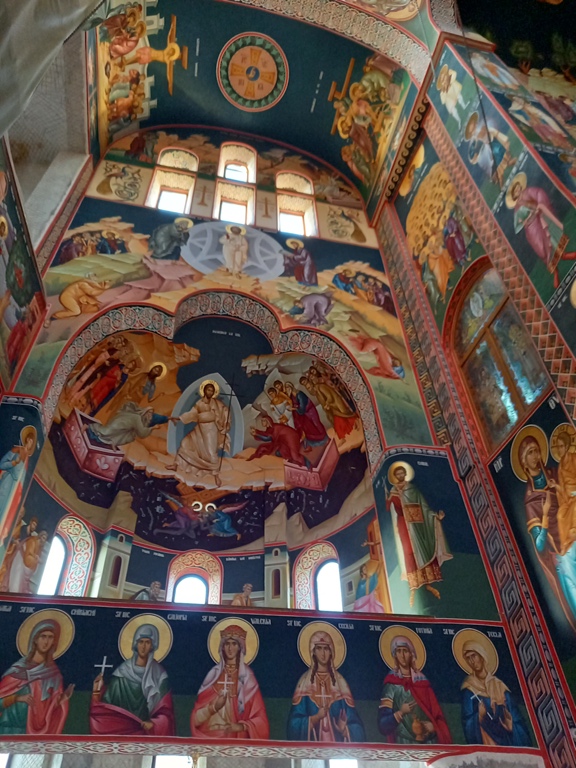 Interiorul a fost pictat în frescă (2008-2009), prezentând scene și personaje biblice.