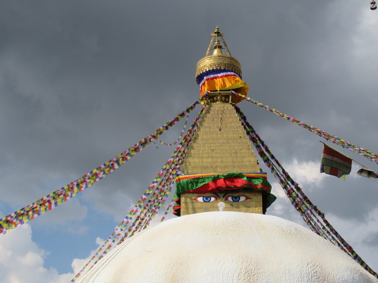 Pe cupolă se află un cub aurit, fiecare latură fiind pictată cu cei 2 ochi ai lui Buddha, reprezentând Înțelepciunea și Compasiunea, deasupra lor un al treilea ochi, despre care se spune că atunci când Buddha predică, emană razele cosmice, acestea fiind mesaje pentru ființele cerești, anunțându-le că pot coborî pentru a-l asculta și pentru ființele infernale, de sub tărâmul uman, care nu pot veni pe pământ, dar sunt alinate de predica lui. Între cei doi ochi, în loc de nas, este pictat simbolul nepalez al cifrei 1, semnificând unitatea tuturor lucrurilor existente în lume și că singura cale spre iluminare este prin învățăturile lui Buddha. Nu au fost pictate urechi, Buddha nefiind interesat de laudele care i se aduc. Pe cub sunt postate 5 statui, reprezentări ale lui Buddha, în est Akshobhya, elementul cosmic al conștiinței, spre vest Amitabha, elementul cosmic al Sanjna, spre sud Ratna Sambhava, elementul cosmic al senzației, spre nord Amoghsiddhi, elementul cosmic al confirmării și central Vairochana, stăpânul templului. De pe cub se înaltă un turn cu 13 niveluri, simbolizând că ființele simțitoare trebuie să treacă prin cele 13 etape ale realizărilor spirituale pentru a atinge iluminarea, care se termină cu un vârf (gajur).