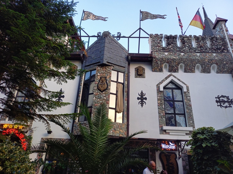 A fost creat imitând forma unui vechi castel, cu turnuri, creneluri, drapele vechi fluturând în vânt, clădirile înconjurând o curte decorată cu plante și statui, amenajată cu terase, unde am servit și eu un ceai.