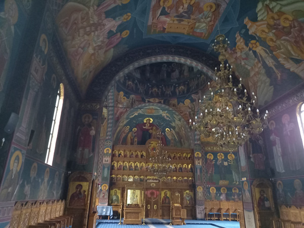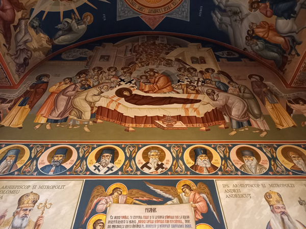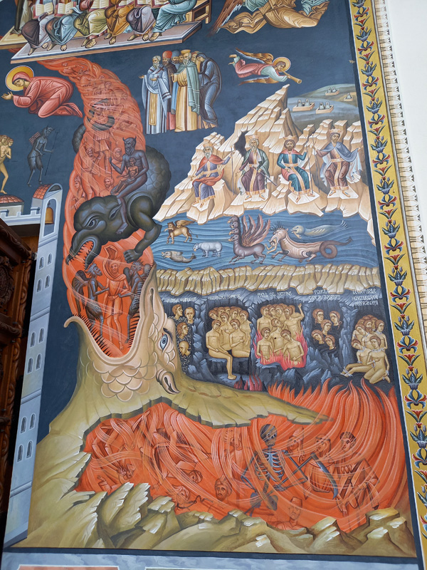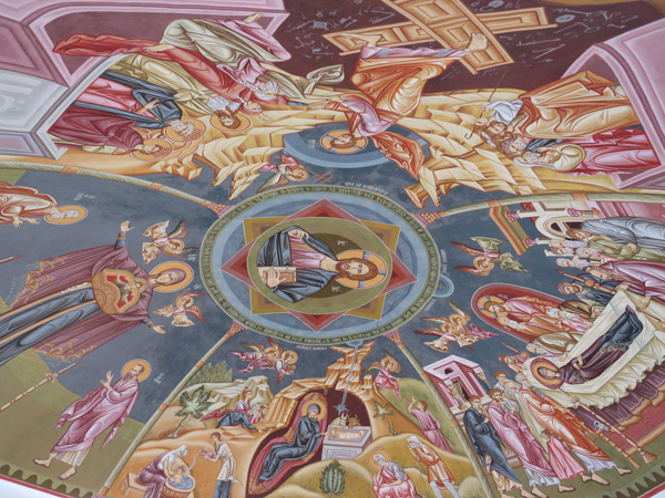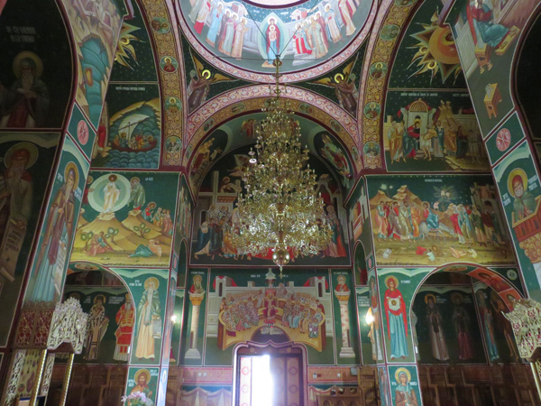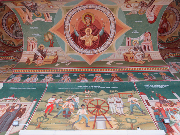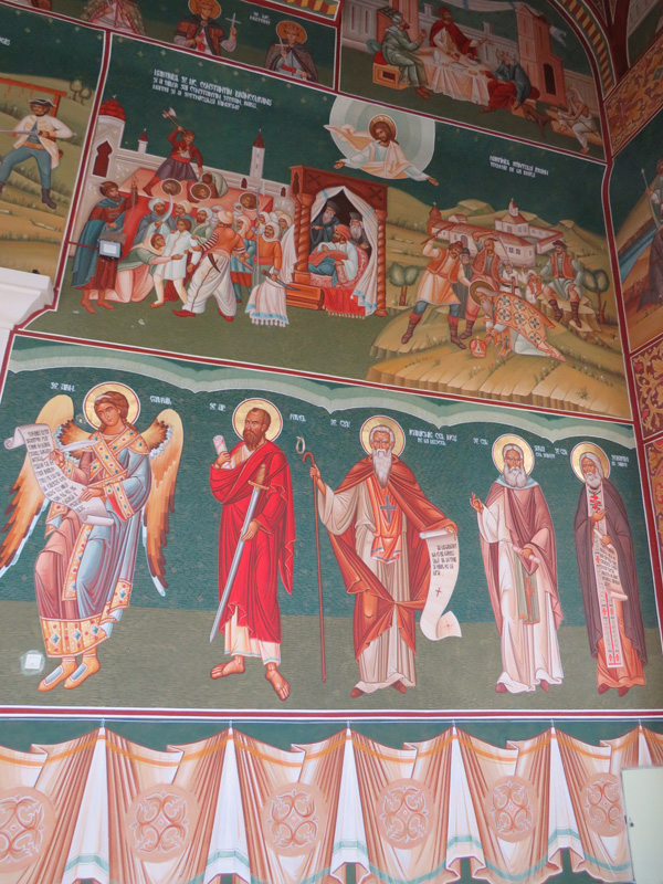 Pridvorul și interiorul au fost ornate cu fresce prezentând scene și personaje biblice.