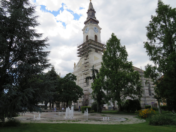 În dreapta ei, o biserică construită în perioada 1774-1806, din 1993 a fost ridicată la rangul de Catedrală Catolică „Înălțarea Domnului” („Az Úr Mennybemenetele” Katolikus székesegyház). Clădirea, în stil baroc târziu, a fost prevăzută cu un turn de 35 metri înălțime, distrus în 1819 de un incendiu, ulterior refăcut și în 1899 dotat cu ceas. Pe parapetul de lângă turn, în cele 4 colțuri, s-au postat statuile celor 4 evangheliști: Sf. Luca, Marcu, Matei și Ioan, deasupra intrării principale Isus predându-i Sf. Petru cheia Cerului și în timpan, deasupra ușii centrale, Sf. Petru și Pavel. În timpul vizitei mele (2024) se efectuau lucrări de renovare ale exteriorului clădirii.