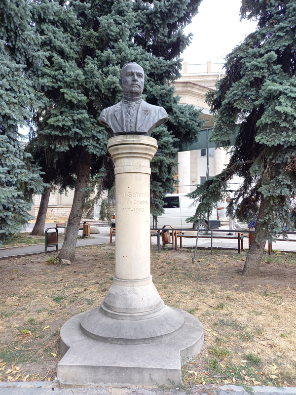 În fața ei, amintind de fostul primar al orașului, e postată statuia Karol Schmick (1877-1903).