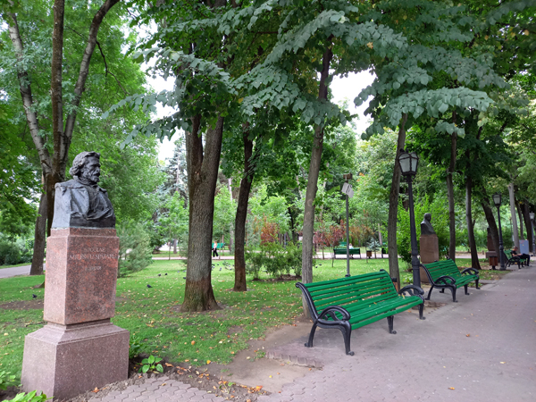 În 1885, în mijlocul unei rondele cu flori, pe un postament înalt, sub forma unei coloane dorice, s-a postat bustul lui Al. Puskin, poet, dramaturg clasic rus (1799-1837).