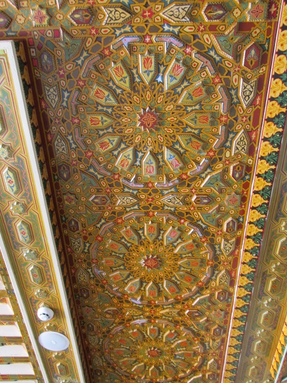 Intrarea în moschee este delimitată de mai multe arcade susținute de coloane duble. În partea superioară prezintă un brâu decorat cu ceramică colorată. Moscheea, imensă, poate găzdui în sala de rugăciune până la 1.000 de persoane.