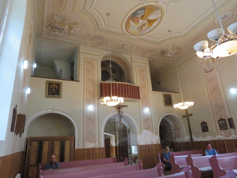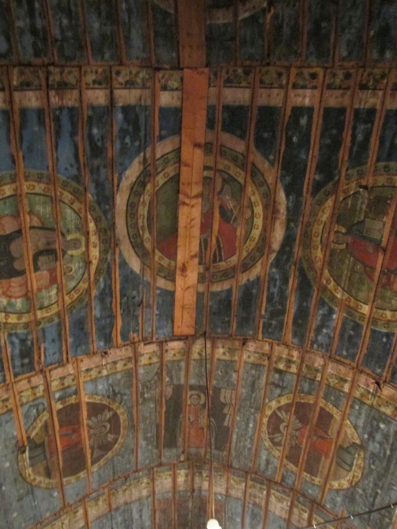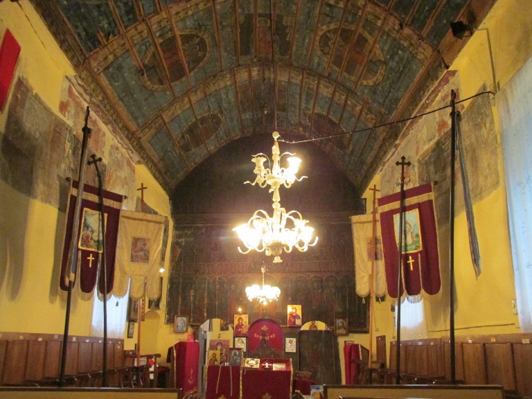 În interior, tavanul din lemn a fost decorat cu picturi reprezentând personaje biblice.