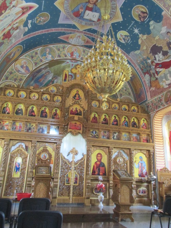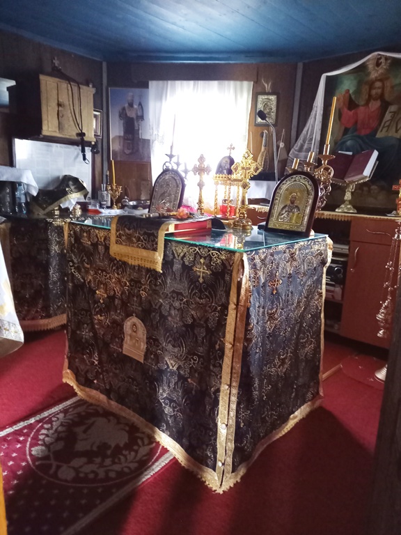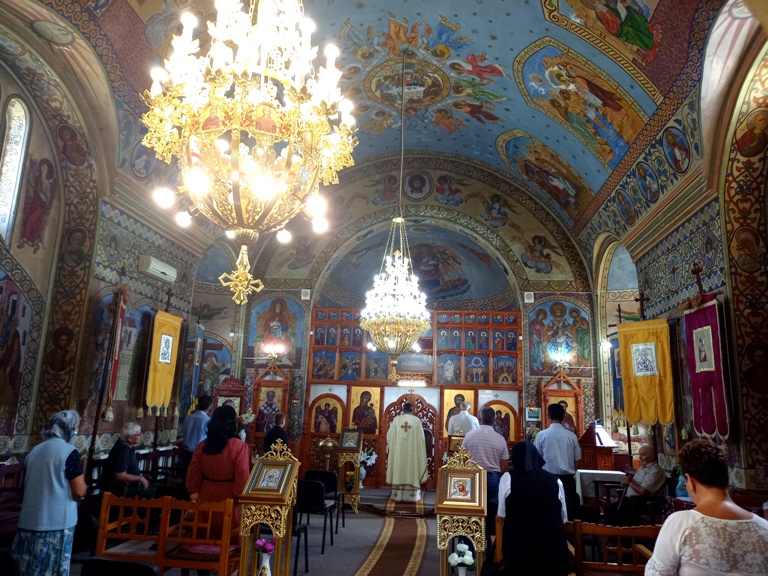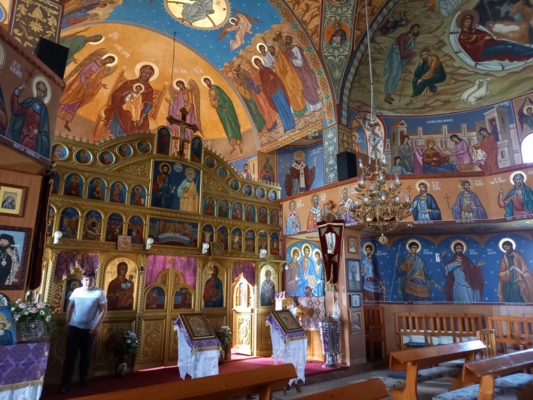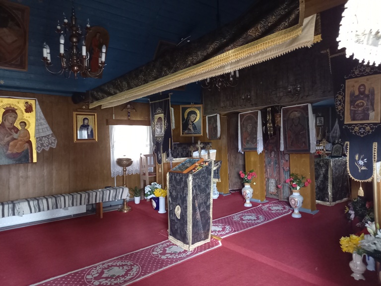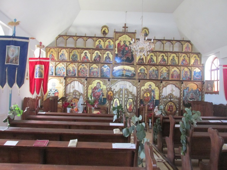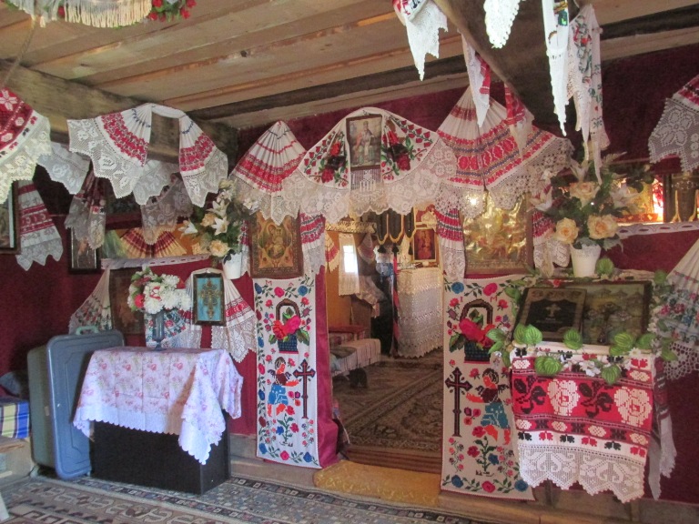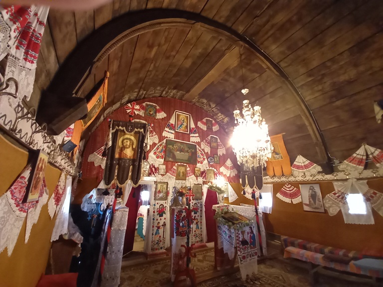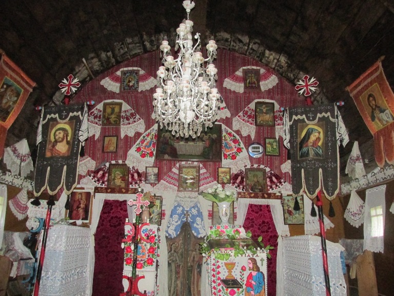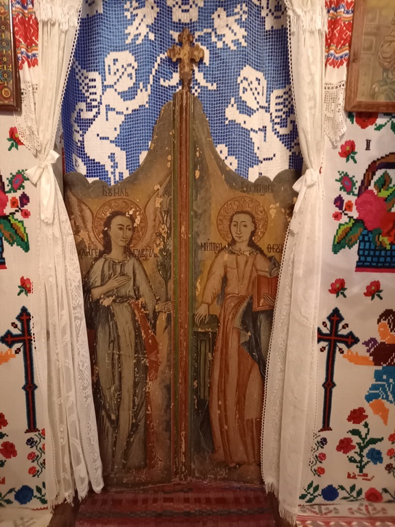 Peretele care desparte naosul de altar a fost tapetat cu material vișiniu, la rândul lui împodobit cu icoane și prosoape.