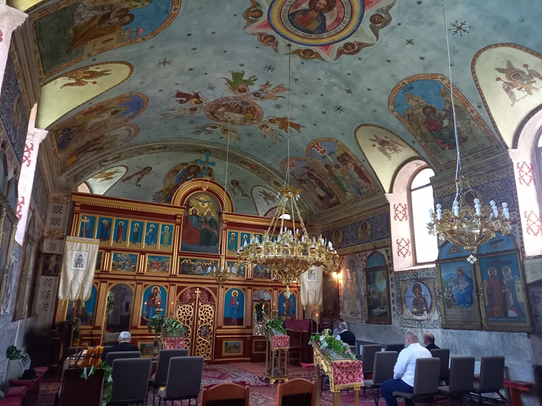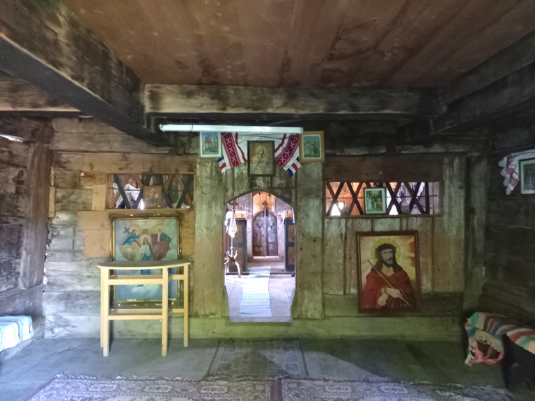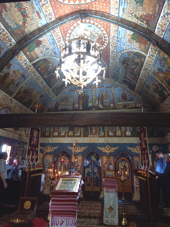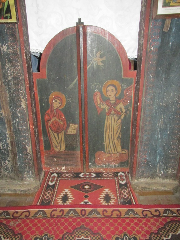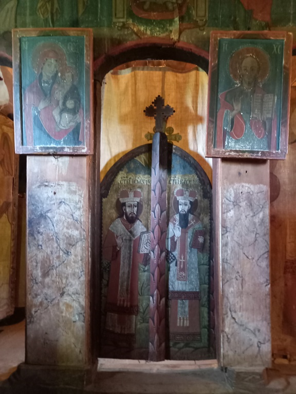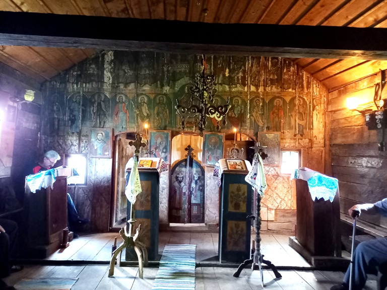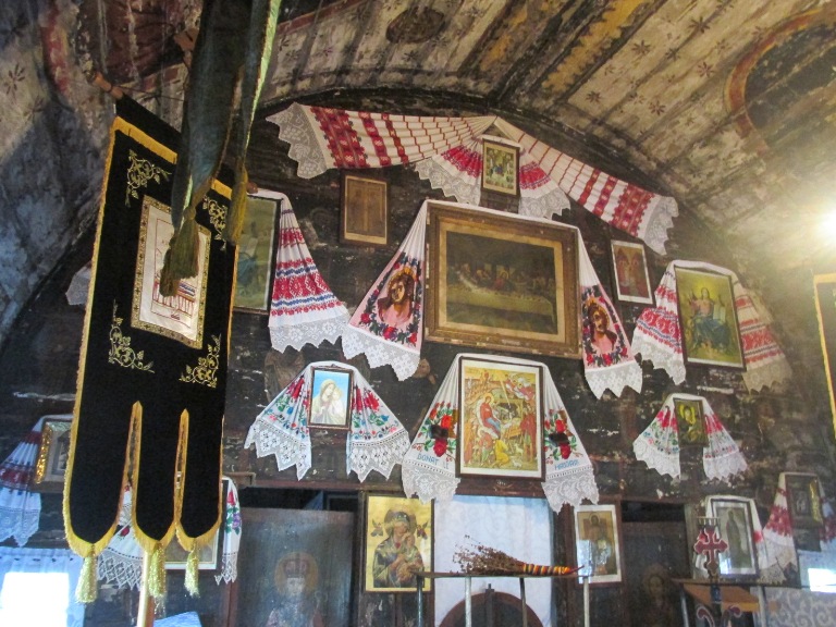 Interiorul, pictat direct pe lemn (1783), azi aproape dispărut, este acoperit de multe prosoape tradiționale.