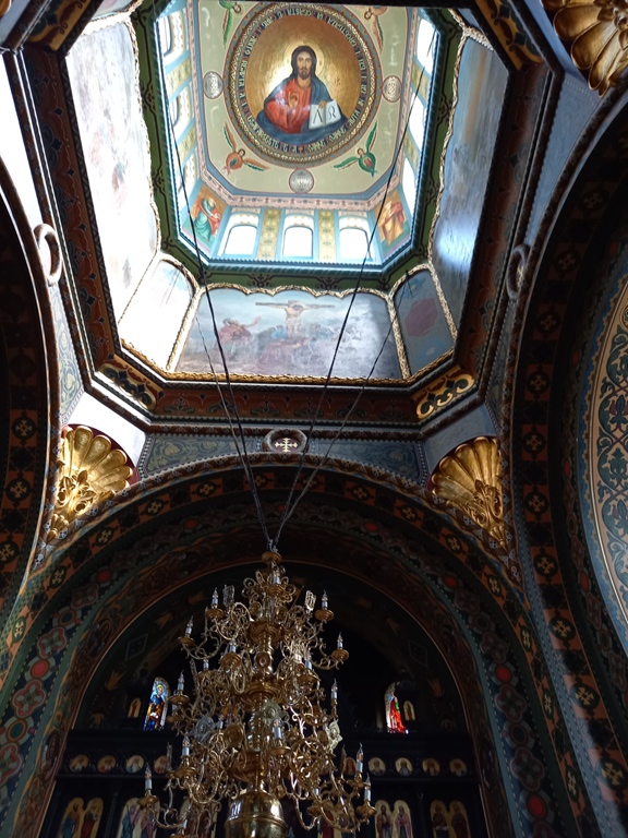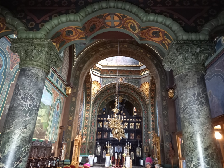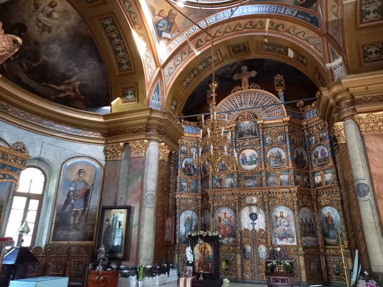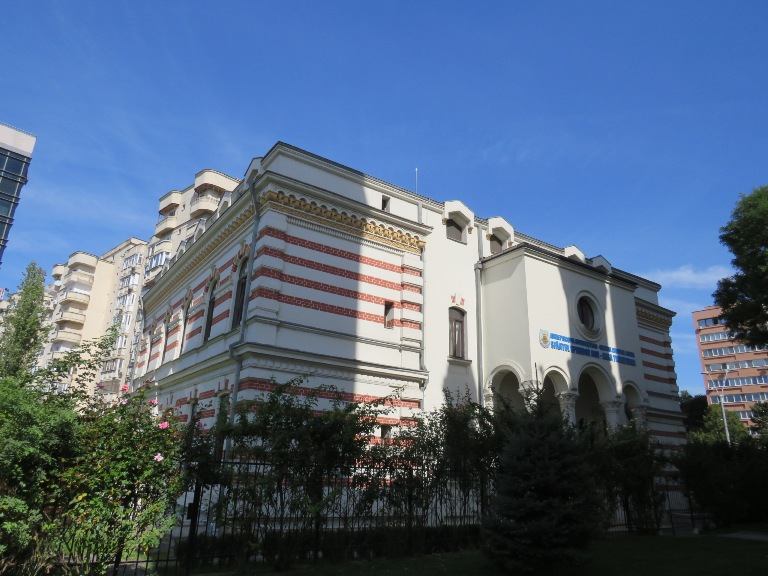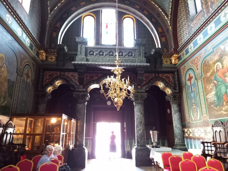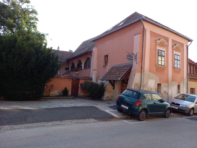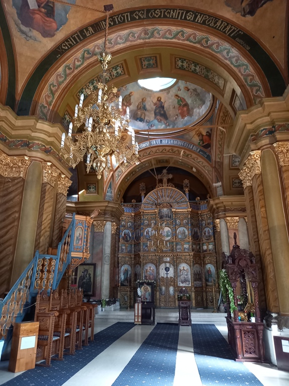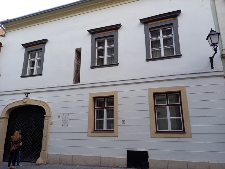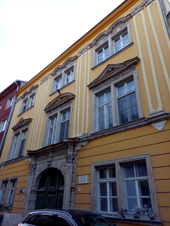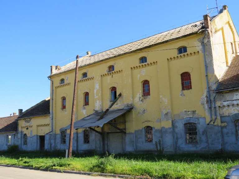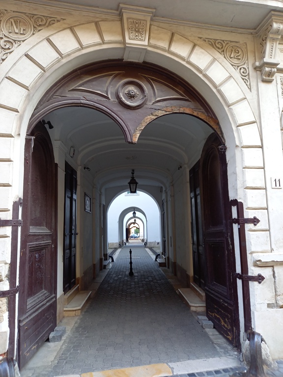 Pe aceeași parte a străzii, în curtea interioară a unei case, pe vremuri deținută de comunitatea evreiască, se află fosta Sinagogă, construită în perioada 1807-1822, fiind ascunsă vederii, în acele timpuri fiind interzis să fie ridicată pe frontul stradal și extinsă la începutul sec. XX, azi nefuncțională, pe care doream neapărat să o văd. Am avut noroc că tocmai atunci a ieșit un personaj pe poartă și m-a lăsat să intru DAR… doar o placă, postată în fața intrării, mai amintește de localnicii evrei exterminați în Al Doilea Război Mondial în lagărele de concentrare…