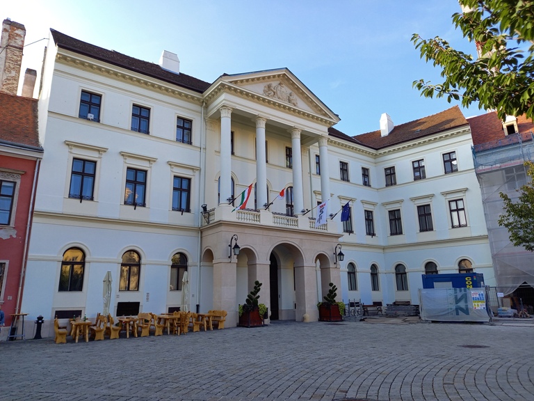Pornind de la catedrală, azi se întinde Piața Szent István, cu străzile mărginite de clădiri de epocă și o alee pietonală centrală care, fiind 1 Mai, era foarte aglomerată, pe ea fiind plasate mai multe tonete cu diverse mărfuri.
