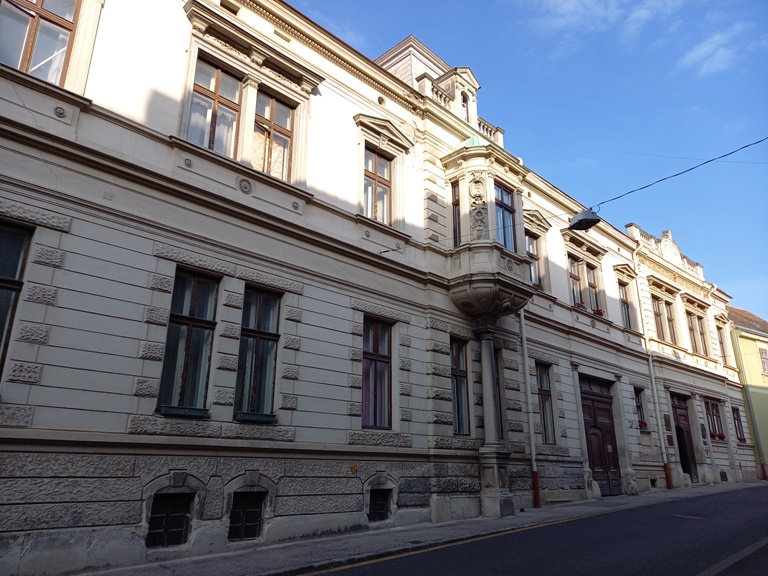 Ieșind din piață am trecut pe lângă o clădire în stil eclectic combinat cu secession, azi numită Palatul de Asigurări, construită la începutul sec. XX pentru filiala Primei Societăți Generale de Asigurări din Ungaria (Első Magyar Általános Biztosító Társaság), înființată în Nagykanizsa în 1857.