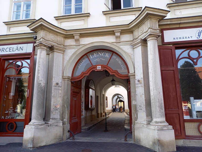 Pentru a se face legătura între cele două părți ale orașului, în unele zone zidurile au fost dărâmate și s-au creat pasaje, unul dintre ele fiind Pasajul Lenck (Lenck átjáró), care trecea prin cele trei curți interioare ale complexului de case deținut de familia Lenck.