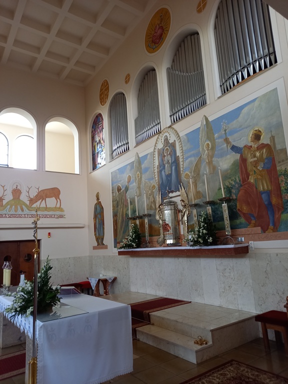 Altarul principal a fost decorat cu statui, prezentându-i pe Sf. Anton, situat central, în dreapta lui Regele Sf. Ștefan și în stânga fiul său, Prințul Sf. Emeric.