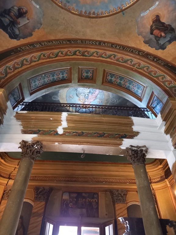 Pronaosul, mic, e despărțit de naos prin 3 arcade, susținute de 4 coloane cu capiteluri dorice, deasupra cărora se află un balcon, cu marginea sculptată în piatră.