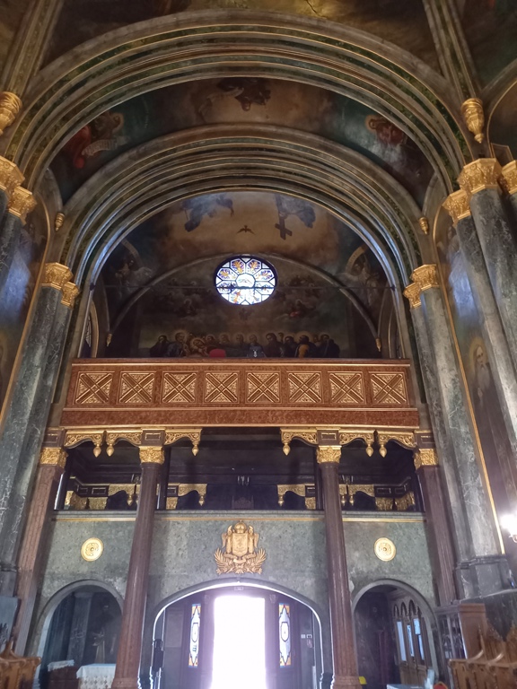 Interiorul, împărțit de arcade decorate cu elemente geometrice și florale, a fost pictat în stil renascentist.