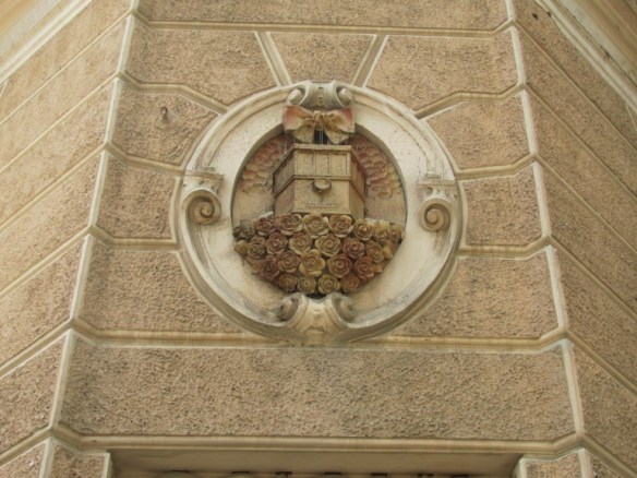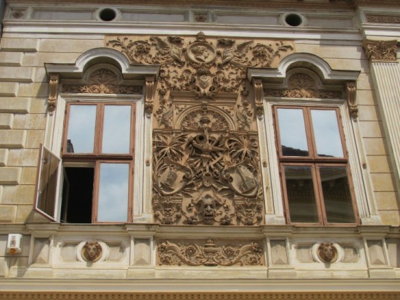 Deasupra ferestrelor a fost decorată cu elemente vegetale, sub ele, capete de leu. În dreptul ferestrelor s-au păstrat până azi ornamentele ceramice care reprezintă „Arte și industrie” (în stânga) și „Comerț și trafic” (în dreapta). Deasupra porții de intrare, în partea superioară a fost inscripționat numele casei lângă care a fost postată stema familiei flancată de două statui.