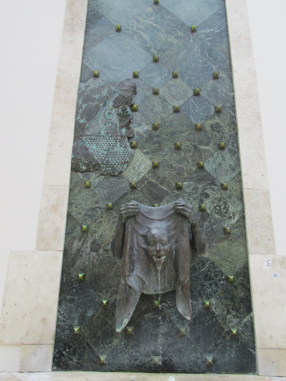 În fața teatrului au fost create două bazine cu apă, fiecare decorat cu câte o sculptură care se referă la actorie, un clovn ascuns în spatele unei măști și o femeie ce privește după o mască.