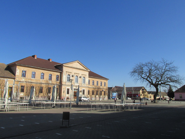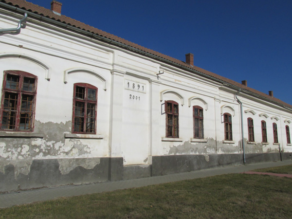 După 5 minute am ajuns la Primăria Mezőhegyes (Polgármesteri Hivatal Mezőhegyes, Kormányablak). Clădirea, în stil eclectic, construită de Herghelia de Stat (1894-1913), a fost folosită pentru cazarea fermierilor necăsătoriți, din care cauză localnicii au numit-o Bridle.