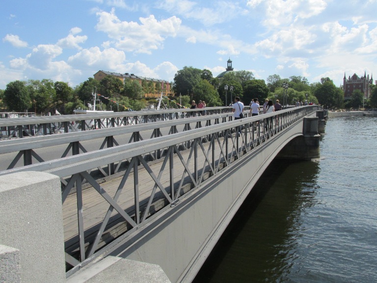 În față se vedea podul pe care urma să trec pe insulă. În acel loc, primul pod a fost construit de un consilier care avea moșia pe insulă (1630). În urma incendiului Palatului Regal (1697) familia regală s-a mutat în Palatul Wrangel situat pe insulă și  cele două poduri au fost lărgite. Demolate între 1784-1789, au fost înlocuite cu un pod de piatră care a supraviețuit până în 1867 când a fost schimbat cu unul nou, din fontă, pentru a face joncțiunea cu noul drum feroviar. Creșterea traficului și introducerea sistemului de  metrou  (anii 1950) au dus la demolarea podului care a fost înlocuit cu șase poduri provizorii apoi cu  pod actual de beton (1958), Riddarholmbron, care traversează autostrada principală Centralbron.