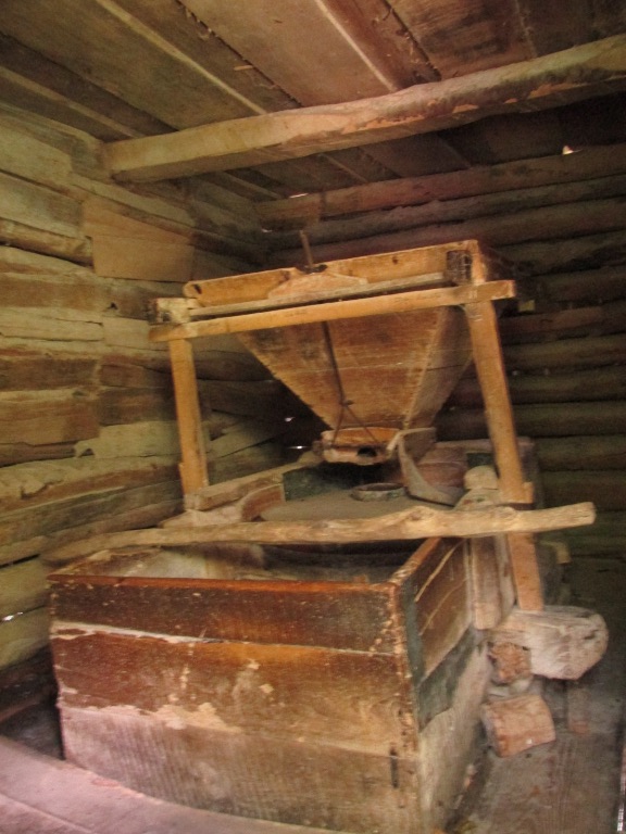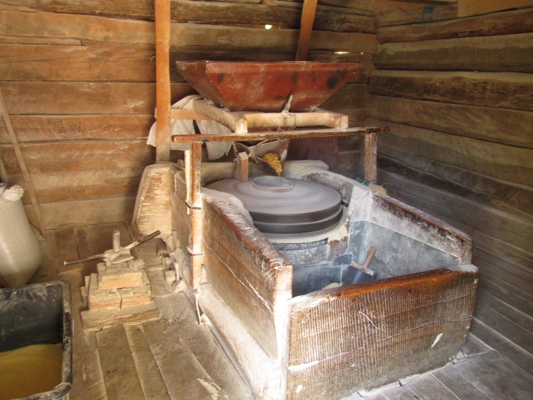 Axul roții este conectat la dispozitivul de măcinare- două pietre șlefuite, suprapuse și găurite la mijloc. Deasupra lor există un vas care este umplut constant cu boabe de porumb sau grâu. Acestea cad printr-un fel de tub în gaura din mijlocul pietrelor, se împrăștie între ele și prin rotație acestea le zdrobesc formând făina care la rândul ei cade într-un recipient.