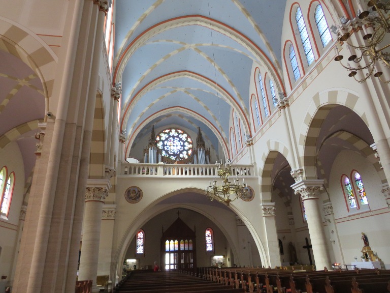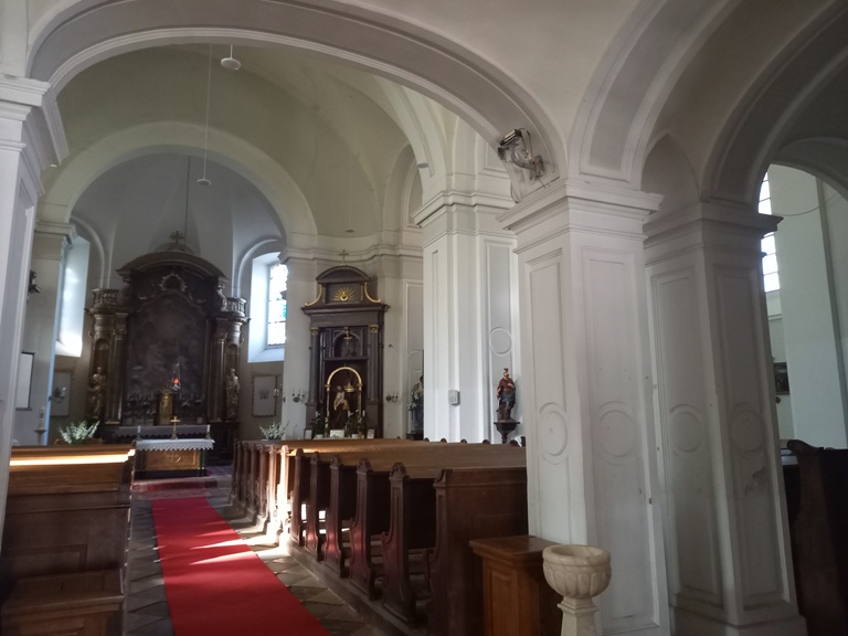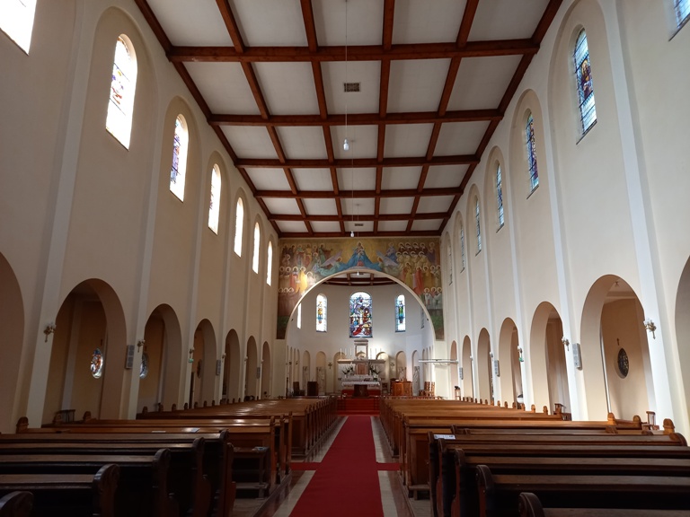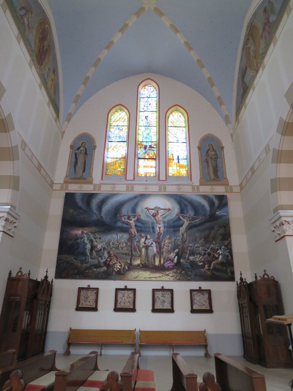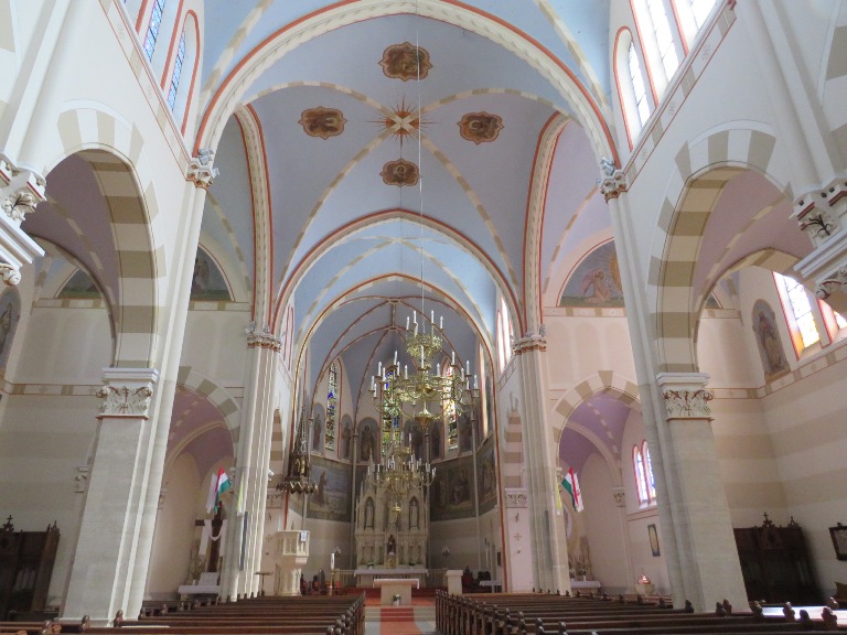 Pereții clădirii au fost prevăzuți cu două șiruri de ferestre pictate, cele superioare reprezentând sfinți maghiari și polonezi și cele inferioare aratând Calea Crucii. Înainte de altar, finalizat în 1961, a fost creată o arcadă, pictată cu scene biblice și deasupra lui a post postată imaginea Sf. Ștefan.