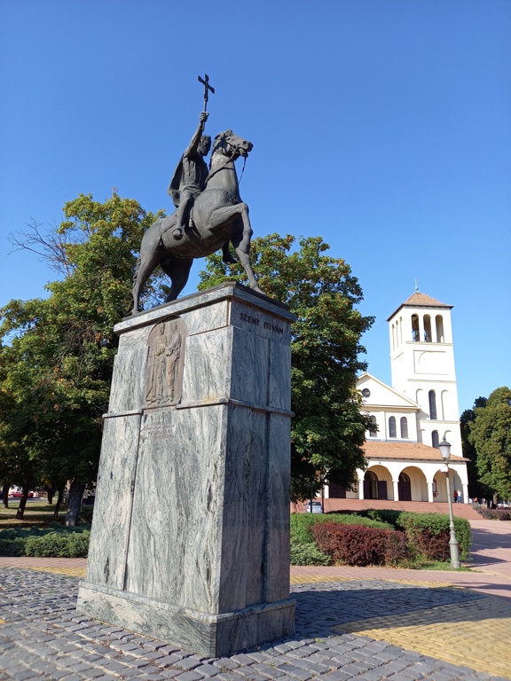 În fața bisericii s-a creat o piață largă în care au fost postate câteva statui. Statuia Regelui Ștefan cel Sfânt a fost inaugurată în 1996. Regele călare, ținând crucea în mâna dreaptă, întinsă spre cer, este așezat pe un piedestal pe care a fost postată o placă sculptată, reprezentându-i pe rege și Sf. Gizela.