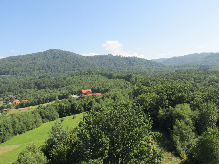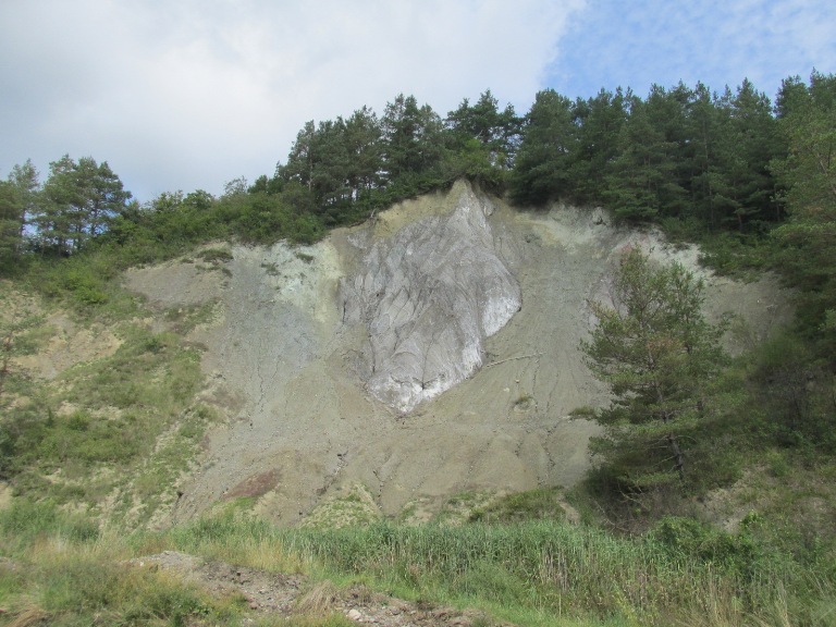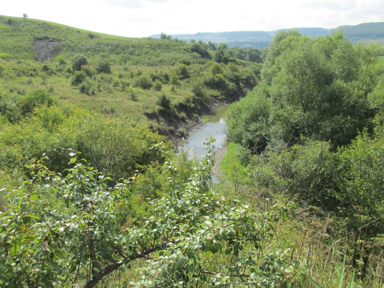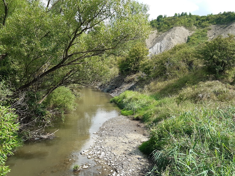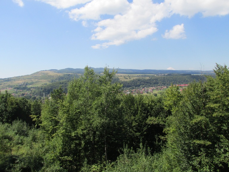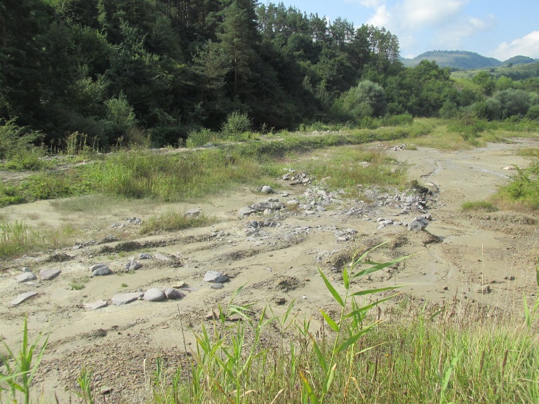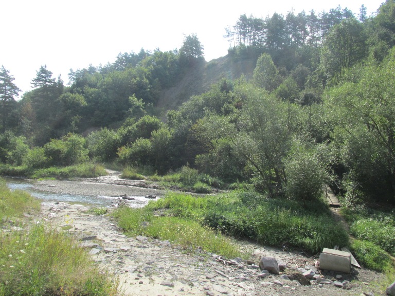 Pe cealaltă parte a pârâului se vedeau versanții de sare, acoperiți de verdeața pădurilor.