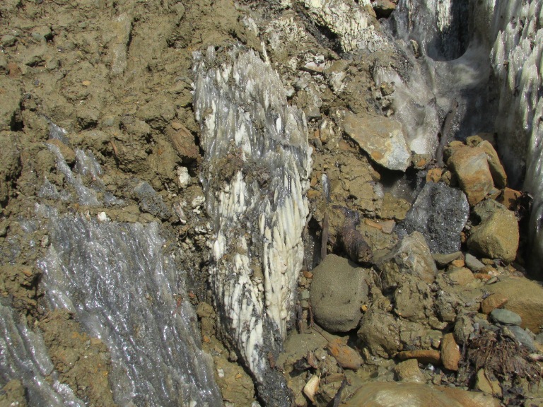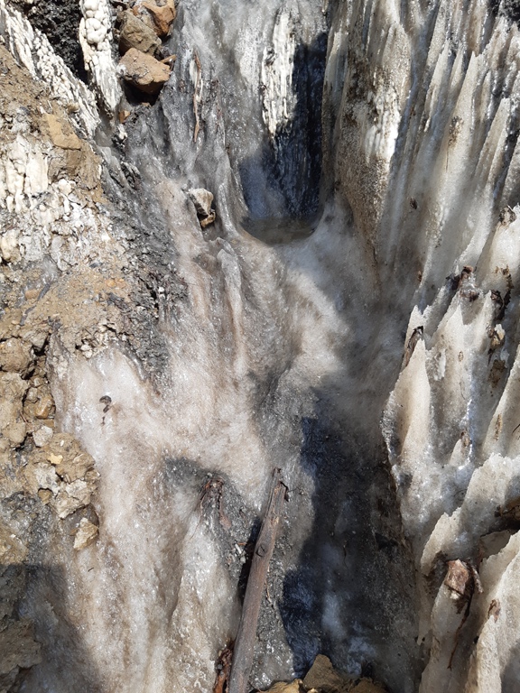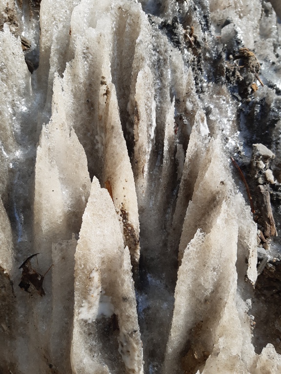 La poalele versanților de sare, intermitent, ies la suprafață izvoare cu apă sărată, formează canale și bălți mici care, sub acțiunea soarelui, se evaporă. Sarea rămasă pe sol, pietre, crengi, cristalizează și formează cruste, inițial mici cât bobul de mazăre. Cu cât fenomenul se perpetuează, sarea acoperă suprafețe tot mai mari.
