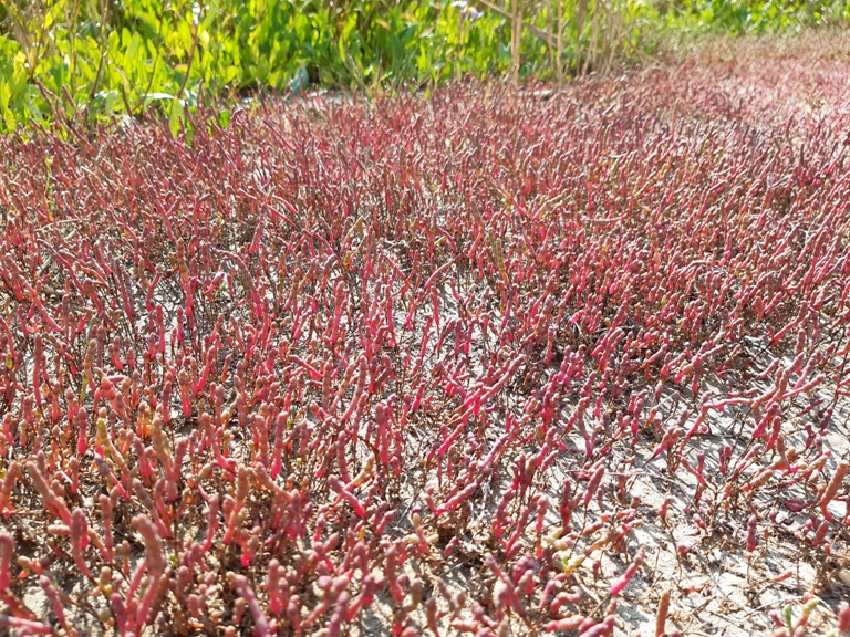 Un covor roșu, cu flori nemaivăzute de mine, mi-a atras atenția. Era format de Salicornia herbacea (brânca), plantă care s-a adaptat și trăiește în mediu sărat (halofilă).