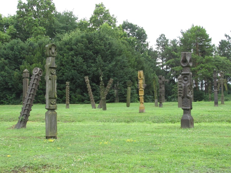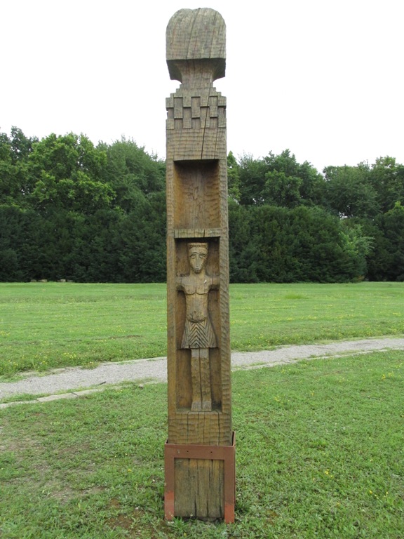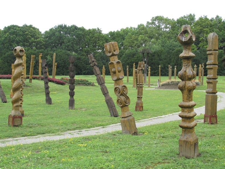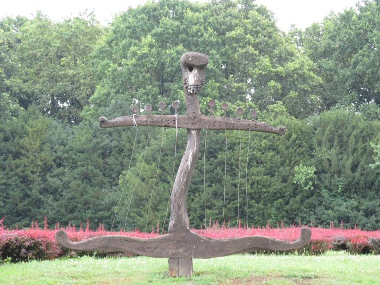 Pe un câmp larg cu iarbă, înconjurat de o pădure de aluni și tise, au fost postați stâlpi de lemn sculptați cu diverse simboluri.