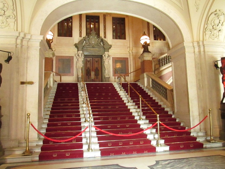 Fațada prezintă un portic cu 3 arcade, decorate cu statuile a patru muze, prin care se intră într-un hol înălțat pe 2 nivele, din care se accesează sala cu o capacitate de 952 locuri. Inițial arcadele erau încadrate de două arcade mai mici pe locul cărora azi se află câte un basorelief, unul înfățișând o scenă de operă, celălalt o scenă de balet.