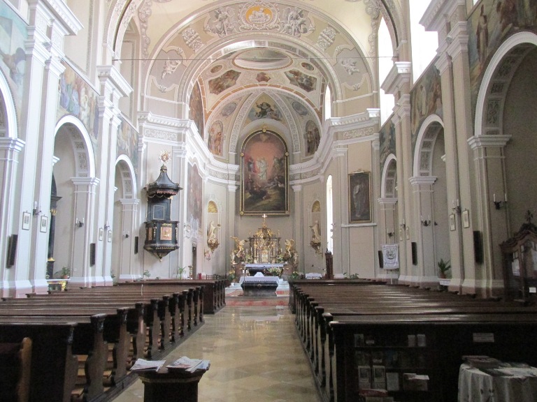 Pe acel loc în secolul XIV a existat o mânăstire construită de iezuiți din care se păstrează o clădire (1651), actuala Casă protopopească. Cu materiale din fosta biserică, iezuiții au construit actuala biserică, în stil baroc târziu și clasicist timpuriu (1787-1793). În spatele ei se întinde cimitirul cu morminte vechi și un mausoleu pentru eroii din Primul Război Mondial.